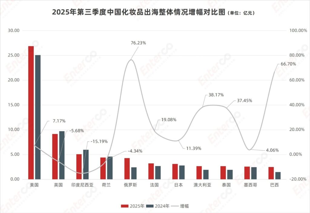 2025年第三季度刚刚落幕,我国化妆品产业出海在该季度稳健发展,全球市场的贸易伙伴也为我们带来了接连不断的惊喜与突破。