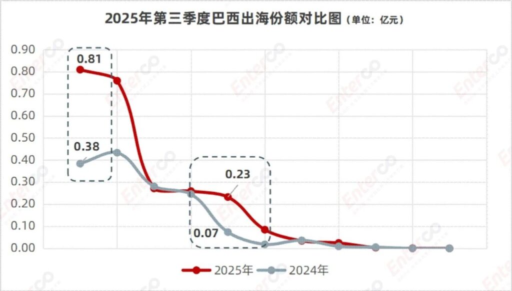 其中,第三季度出海巴西共2.48亿元,同比增幅66.66%。【其他美容品或化妆品及护肤品】出口总额为8094万元,同比增幅110.91%;【指(趾)甲化妆品】出口共2324万元,同比增幅215.48%。