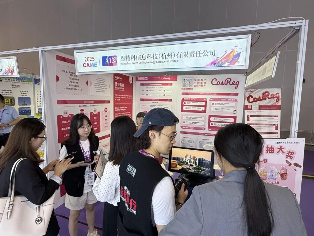 2025年9月25日至27日,恩特科技携最新研发的中国化妆品法规智能助手CosReg亮相2025中国香料香精化妆品行业年会暨精品博览会(2025CAME)。展会于在南京扬子江国际会议中心盛大举行。恩特科技围绕“智能驱动合规未来”主题,现场展示全新AI赋能化妆品行业的解决方案,该方案依托深度学习与中国法规数据库,可助力企业高效应对化妆品监管要求,降低合规成本。