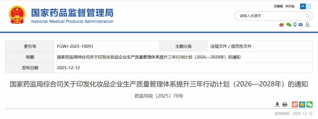 现将《化妆品企业生产质量管理体系提升三年行动计划(2026—2028年)》印发给你们,请结合实际,认真贯彻落实。