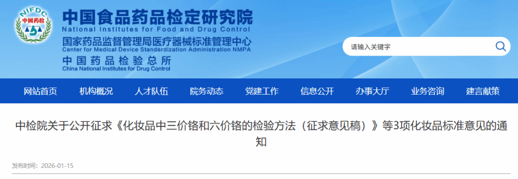为进一步完善化妆品技术标准,中检院组织制定了《化妆品中三价铬和六价铬的检验方法》等3项化妆品标准制修订项目征求意见稿(附件1—3),现公开征求意见。请按要求在“化妆品标准制修订管理系统”(https://www.nifdc.org.cn/nifdc/bshff/hzhpbzh/hzhpbzhxt/index.html)中反馈意见,截止时间为2026年2月24日。
