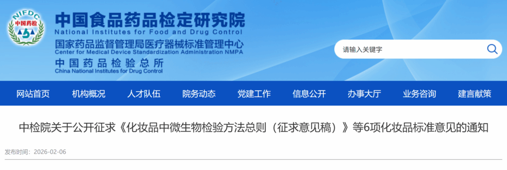 为进一步完善化妆品技术标准,中检院组织制定了《化妆品中微生物检验方法总则》等6项化妆品标准制修订项目征求意见稿(附件1—6),现公开征求意见。请按要求在“化妆品标准制修订管理系统”(https://www.nifdc.org.cn/nifdc/bshff/hzhpbzh/hzhpbzhxt/index.html)中反馈意见,截止时间为2026年3月22日。
