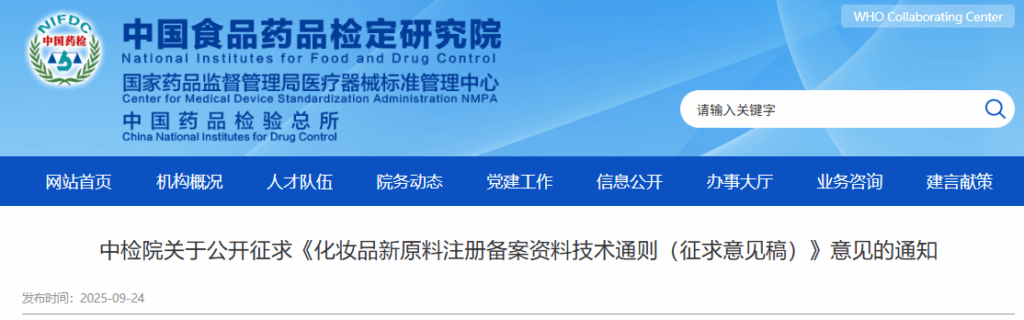 中检院关于公开征求《化妆品新原料注册备案资料技术通则(征求意见稿)》意见的通知