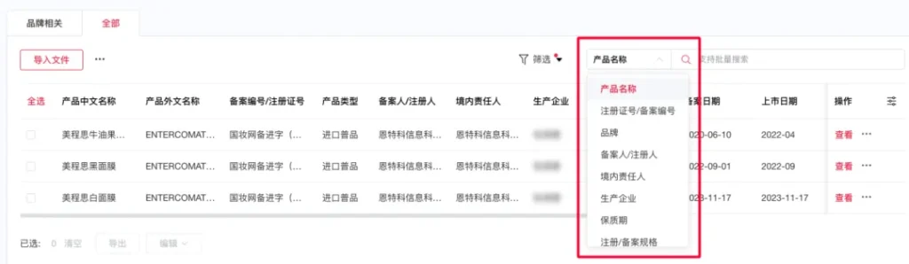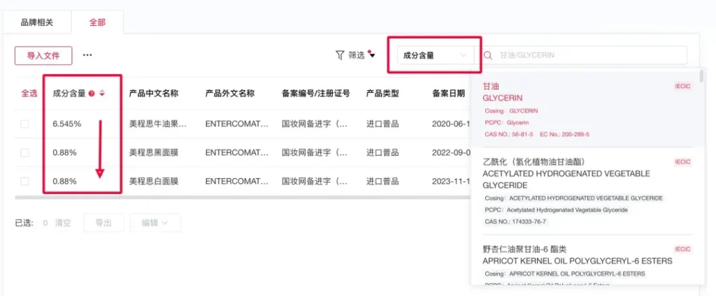 举个例子:用户在“产品信息”中输入关键词「甘油」,系统就会列出所有含甘油的已备案产品,并按含量降序排序,同时支持一键查看其配方与备案详情。