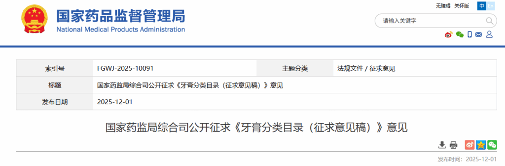 公开征求意见的时间是2025年12月1日—22日。有关单位和个人可以将意见反馈至hzpjgs@nmpa.gov.cn。请在电子邮件主题注明“牙膏分类目录—意见建议反馈”。