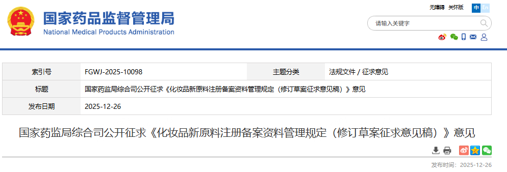 公开征求意见时间为2025年12月26日—2026年1月25日。相关意见建议请填写反馈表(见附件2),反馈至电子邮箱hzpjgyc@nmpa.gov.cn,并在邮件标题注明“化妆品新原料注册备案资料管理规定反馈意见”。