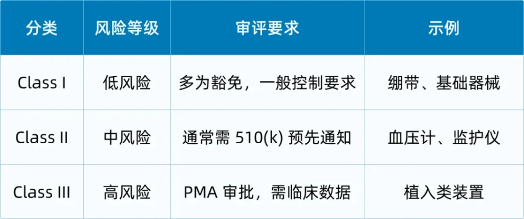 美国对医疗器械采取“风险分类”制度,这决定了后续所有的审查深度与资料要求。以下是一张简洁的对照表,帮助你快速理解分类差异: